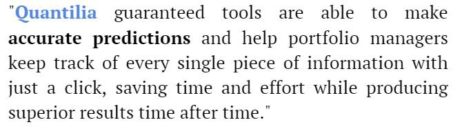 Quantilia’s guaranteed tools are able to make accurate predictions and help portfolio managers keep track of every single piece of information with just a click, saving time and effort while producing superior results time after time.